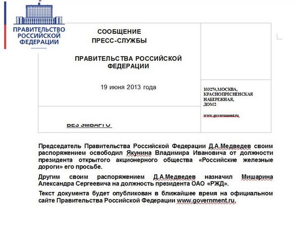Сообщение об отставке главы РЖД пришло IP-адреса, не совпадающего с адресом пресс-службы правительства. |